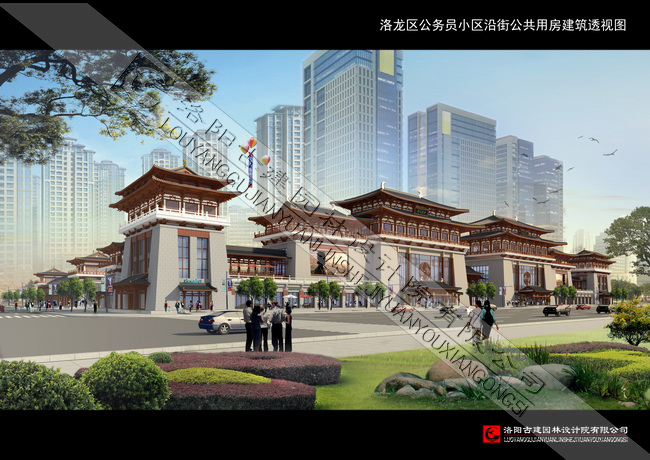 洛陽市洛龍區(qū)公務(wù)員小區(qū)沿龍門大道建筑為仿唐風(fēng)墩臺式建筑群,南北長110米,東西寬40多米,高四層局部五層。唐代建筑規(guī)模宏大,氣勢磅礴,形體俊美,莊重大方,整齊而不呆板,華美而不纖巧,舒展而不張揚,古樸卻富有活力,建筑藝術(shù)加工和結(jié)構(gòu)的完美統(tǒng)一,斗拱的結(jié)構(gòu)、柱子的形象、梁的加工等都達到了力與美的統(tǒng)一。而色調(diào)簡潔明快,屋頂舒展平遠,門窗樸實無華,給人莊重,大方的印象。