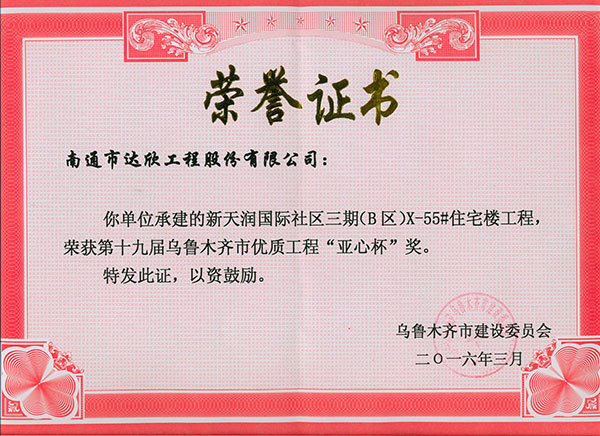 另訊,由我工程公司承建的新天潤國際社區三期(B區)X-55#住宅樓工程,榮獲第十九屆烏魯木齊市優(yōu)質(zhì)工程“亞心杯”獎。