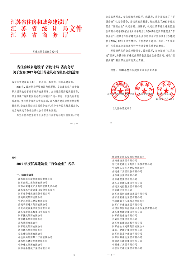 日前,江蘇省住房城鄉建設廳、江蘇省統計局、江蘇省商務(wù)廳聯(lián)合發(fā)布2017年度全省建筑業(yè)“百強企業(yè)”名單,南通市達欣工程股份有限公司以出色的業(yè)績(jì)連續四年榮登百強企業(yè)榜單,綜合實(shí)力類(lèi)排名第21名。