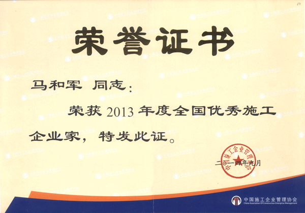 中國施工企業(yè)管理協(xié)會(huì )于今年2月發(fā)出召開(kāi)“2014年全國施工企業(yè)領(lǐng)軍人物峰會(huì )”的通知,根據通知要求,嚴格按照“全國優(yōu)秀施工企業(yè)家”條件在全國范圍內優(yōu)選參會(huì )代表。經(jīng)申請、推薦、審核、公示,中國施工企業(yè)管理協(xié)會(huì )企業(yè)家工作委員會(huì )審定,確定166位企業(yè)領(lǐng)導為“2014年全國施工企業(yè)領(lǐng)軍人物峰會(huì )”參會(huì )人選并授予“全國優(yōu)秀施工企業(yè)家”榮譽(yù)稱(chēng)號。公司董事長(cháng)馬和軍榮列榜單之中。