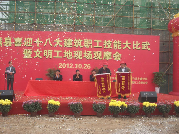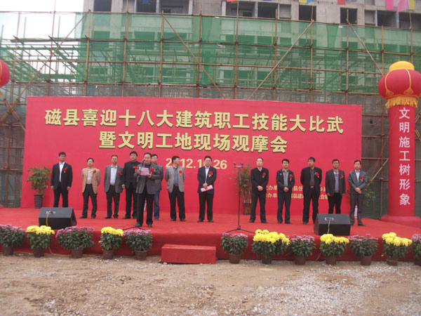 10月26日,由磁縣住房和城鄉建設局主辦,磁縣建筑建材工會(huì )聯(lián)合會(huì )承辦的“磁縣喜迎十八大建筑職工技能比武大會(huì )暨文明工地現場(chǎng)觀(guān)摩會(huì )”在寶盛世紀B區二期項目現場(chǎng)隆重舉行。邯鄲市住房和城鄉建設局建管處處長(cháng)袁中英、邯鄲市建管辦主任邢文革、磁縣副縣長(cháng)高強、磁縣住建局副局長(cháng)趙志彬、馮保民、張彥華等領(lǐng)導出席開(kāi)幕儀式,第四工程公司邯鄲項目總指揮陳仁富陪同出席。