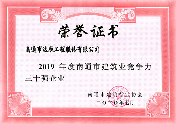 根據《關(guān)于開(kāi)展2019年度南通市建筑業(yè)“雙三十強”及“三優(yōu)”評價(jià)工作的通知》(通建協(xié)〔2020〕2號),經(jīng)評審委員會(huì )對“雙三十強”企業(yè)及“三優(yōu)”初審結果進(jìn)行復核、審查,最終公司獲得2019年度南通市建筑業(yè)競爭力三十強企業(yè),評價(jià)排名第11位,馬和軍同志獲得南通市建筑業(yè)優(yōu)秀企業(yè)家,楊靜同志獲得南通市建筑業(yè)優(yōu)秀企業(yè)經(jīng)理。