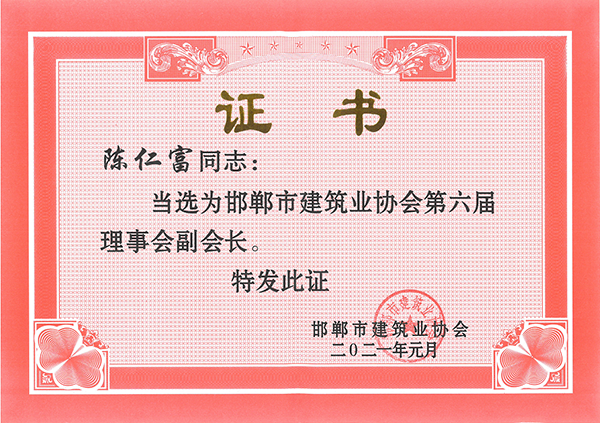 2021年1月8日,邯鄲市建筑業(yè)協(xié)會(huì )第六屆會(huì )員大會(huì )第二次會(huì )議在邯鄲舉行。會(huì )上,第三工程公司總經(jīng)理陳仁富當選為邯鄲市建筑業(yè)協(xié)會(huì )第六屆理事會(huì )副會(huì )長(cháng)。
