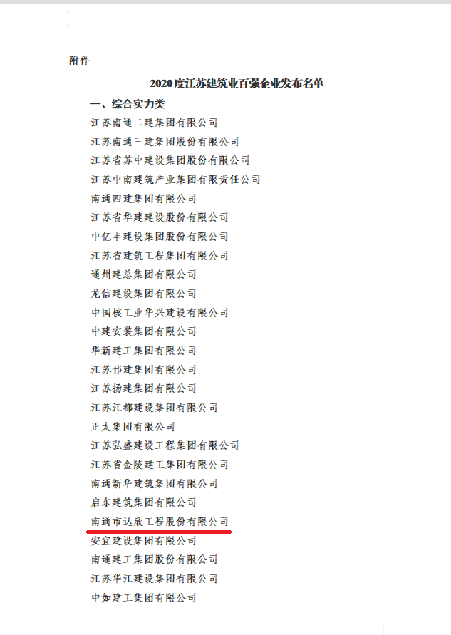 江蘇省住房城鄉建設廳、江蘇省統計局、江蘇省商務(wù)廳聯(lián)合發(fā)布2020年度全省建筑業(yè)“百強企業(yè)”名單,南通市達欣工程股份有限公司以卓有成效的業(yè)績(jì)連續七年榮登百強企業(yè)榜單,綜合實(shí)力類(lèi)排名第22名。