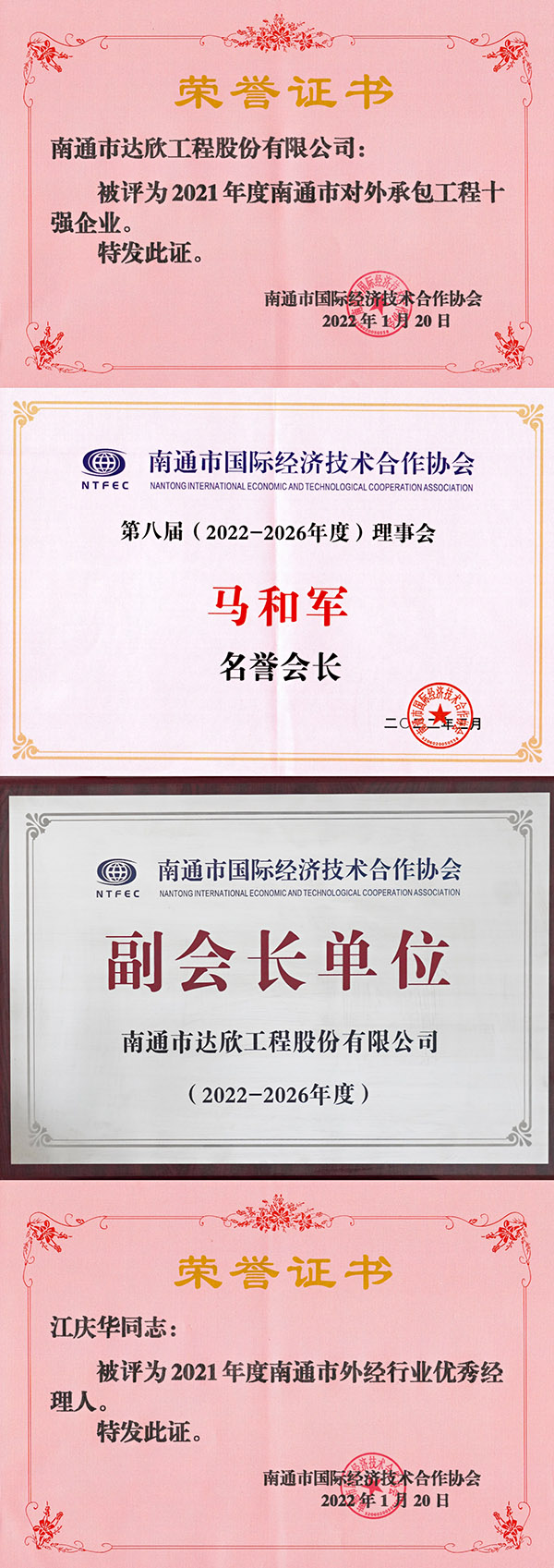 會(huì )上,達欣集團被評為2021年度南通市對外承包工程十強企業(yè),董事長(cháng)馬和軍當選第八屆(2022-2026年度)理事會(huì )名譽(yù)會(huì )長(cháng),企業(yè)當選為副會(huì )長(cháng)單位,柬埔寨分公司江慶華被評為南通市外經(jīng)行業(yè)優(yōu)秀經(jīng)理人。