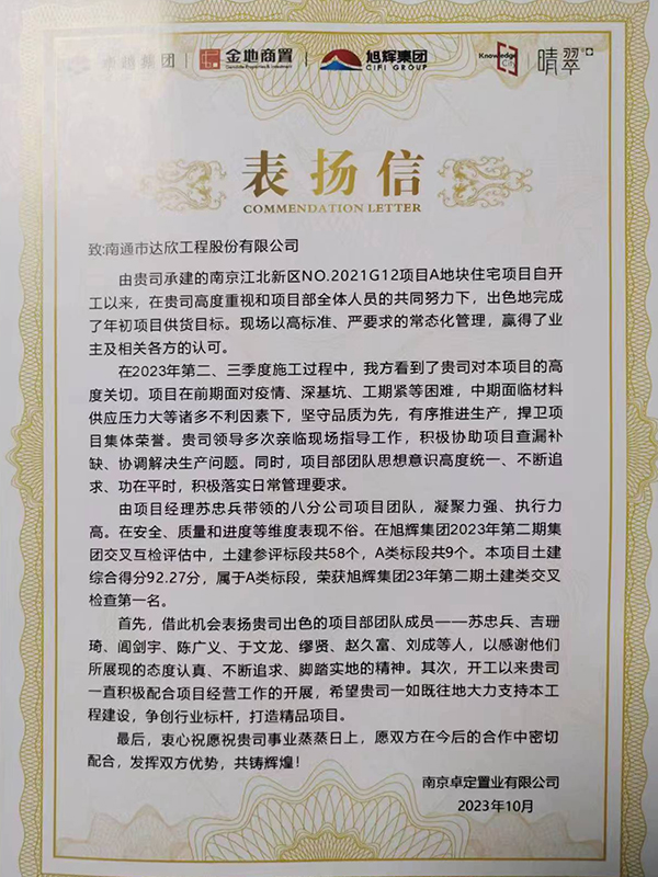 近日,公司收到南京卓定置業(yè)有限公司發(fā)來(lái)的表?yè)P信,對公司南京G12項目管理團隊出色完成年初項目預期目標,以及在項目建設中表現出的專(zhuān)業(yè)、認真、負責的態(tài)度,不畏困難、迎難而上的精神,高標準、嚴要求的工作作風(fēng)提出贊揚和認可。此外,該項目在旭輝集團2023年第二期土建類(lèi)檢查中榮獲第一名的好成績(jì)。