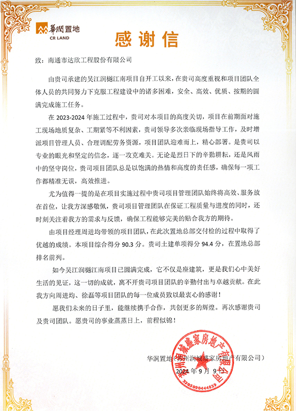 近日,公司收到華潤置地發(fā)來(lái)的感謝信,信中對集團第一工程公司承建的吳江潤樾江南項目在施工過(guò)程中攻堅克難,嚴把安全生產(chǎn)關(guān),促進(jìn)項目履約,為華潤置地高質(zhì)量發(fā)展作出的貢獻表示感謝。