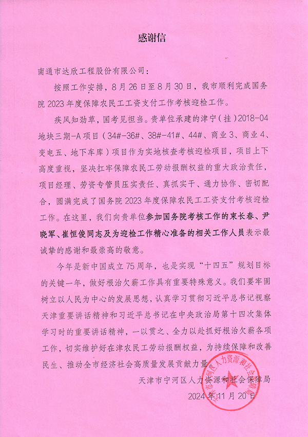近日,第六工程公司承建的津寧(掛)2018-04地塊項目三期工程代表天津市參加2023年度國家級省際交叉核查,在國務(wù)院針對省級根治欠薪工作整體情況的檢查中成績(jì)優(yōu)異,榮獲“標桿項目”榮譽(yù)稱(chēng)號,并對迎檢過(guò)程中全體工作人員真抓實(shí)干、通力協(xié)作的精神表示感謝。