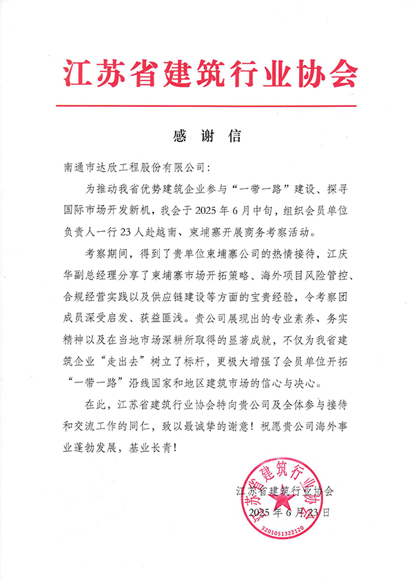 6月23日,集團收到來(lái)自江蘇省建筑行業(yè)協(xié)會(huì )的感謝信。信中對集團柬埔寨公司在省協(xié)會(huì )組織會(huì )員單位赴柬埔寨商務(wù)考察期間,以專(zhuān)業(yè)實(shí)力與豐富的實(shí)踐為考察團提供有益的幫助,特此專(zhuān)函致謝。