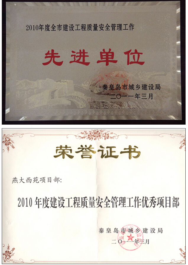 2011年3月8日,秦皇島市城鄉建設局召開(kāi)2010年度全市建設工程質(zhì)量安全管理工作先進(jìn)單位和先進(jìn)個(gè)人表彰大會(huì ):第三工程公司獲2010年度秦皇島市建設工程質(zhì)量安全管理工作先進(jìn)單位;燕大西苑三標段項目部獲優(yōu)秀項目部;燕大西苑三標段項目經(jīng)理楊禮虎獲優(yōu)秀項目經(jīng)理。