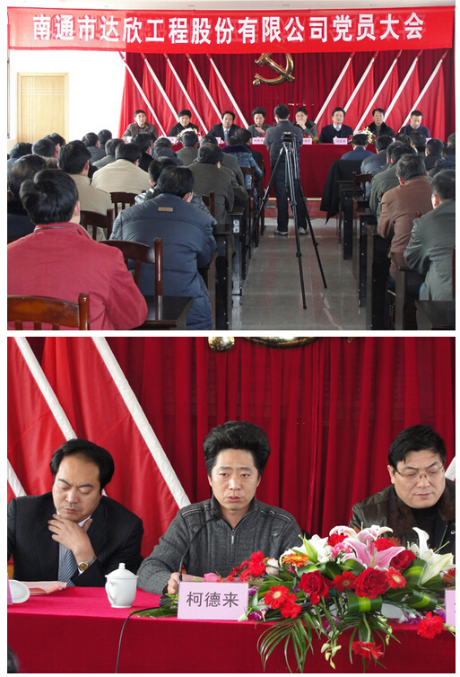 2月20日下午,公司全體黨員聚集在黨員活動(dòng)室召開(kāi)南通市達欣工程股份有限公司黨員大會(huì )??h委常委、常務(wù)副縣長(cháng)柯德來(lái)、縣人大副主任、組織部副部長(cháng)章曙東、組織部副部長(cháng)陳興俊、組織科科長(cháng)成剛、吉清海、鎮黨委書(shū)記盧忠平、鎮長(cháng)錢(qián)亞洲及鎮黨委等領(lǐng)導在百忙之中參加了我公司的黨員大會(huì )。這次黨員大會(huì )共選舉產(chǎn)生了七位黨委委員:丁興元、馬和軍、劉厚純、陳春紅、徐仁忠、溫鶴華、謝果生,選舉產(chǎn)生了三位紀委委員:王建國、楊靜、徐仁忠。劉厚純任公司黨委書(shū)記、馬和軍任公司黨委副書(shū)記、徐仁忠任公司紀委書(shū)記。
