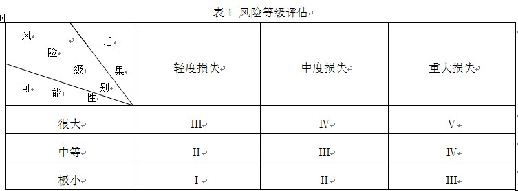 在對危險源識別的基礎上,評估危險源造成風(fēng)險可能性和大小,對風(fēng)險進(jìn)行分級,對不同等級風(fēng)險采用相應的風(fēng)險控制措施。風(fēng)險等級評估:Ⅰ級為可忽略風(fēng)險;Ⅱ級為可接受風(fēng)險;Ⅲ級為中度風(fēng)險;Ⅳ級為重大風(fēng)險;Ⅴ級為不容許風(fēng)險,如表1。