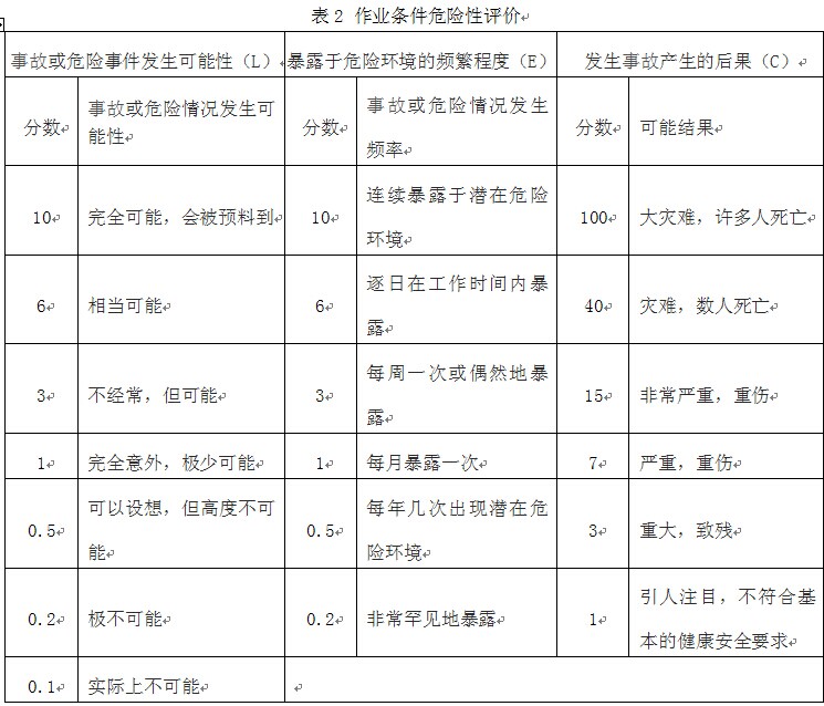 風(fēng)險等級評估通常采用“作業(yè)條件危險性評價(jià)法”,根據事故發(fā)生的可能性、暴露于危險環(huán)境的頻繁程度和事故發(fā)生后的后果嚴重程度進(jìn)行綜合評分,來(lái)確定風(fēng)險等級,如表2。