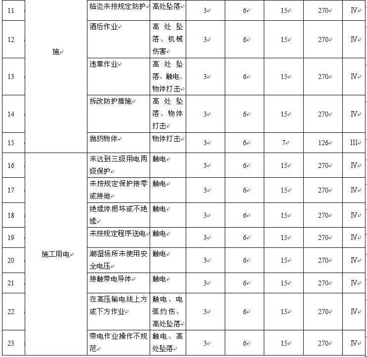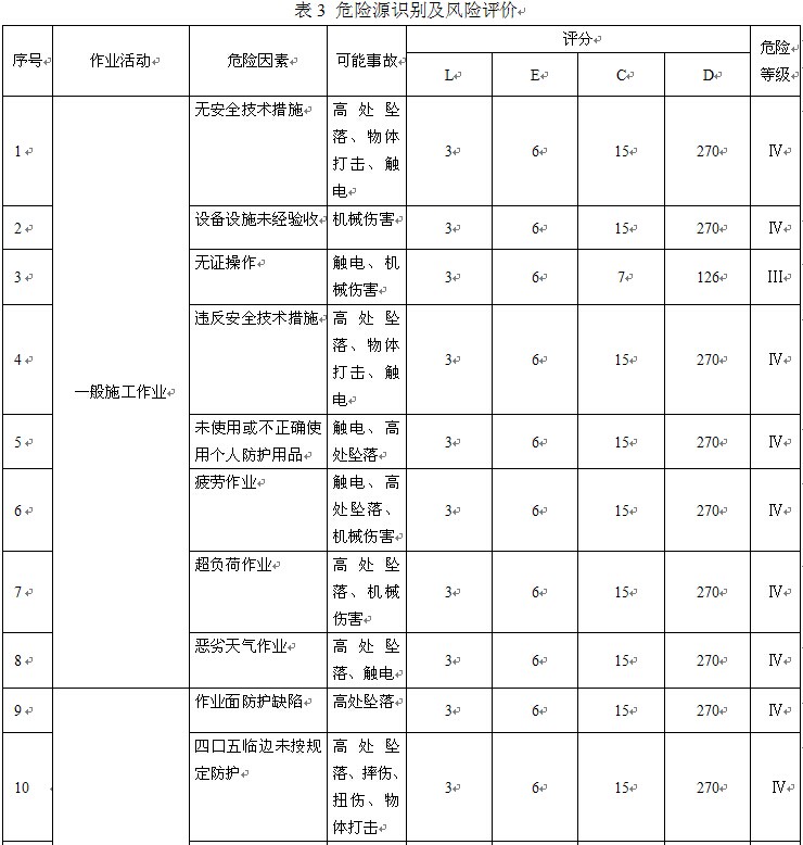 本公司目前在建的主要工程有:重慶直升機投資有限公司項目(包括總裝廠(chǎng)房、交付中心和教學(xué)大樓),重慶機床集團搬遷項目(包括廠(chǎng)房、科技大樓、倒班宿舍)。公司針對兩個(gè)施工現場(chǎng)特點(diǎn)進(jìn)行分析,制訂了危險源識別及風(fēng)險評價(jià)表,部分內容如表3。
